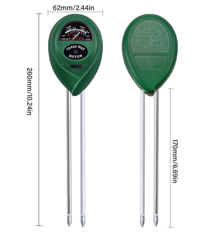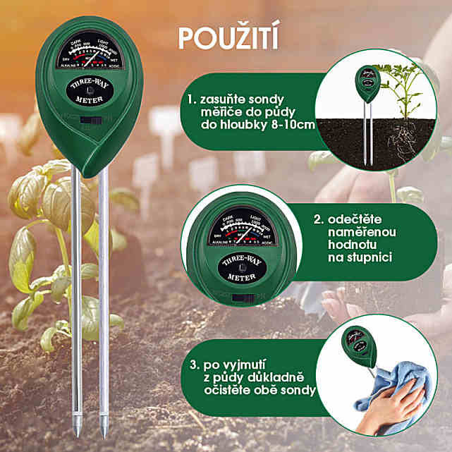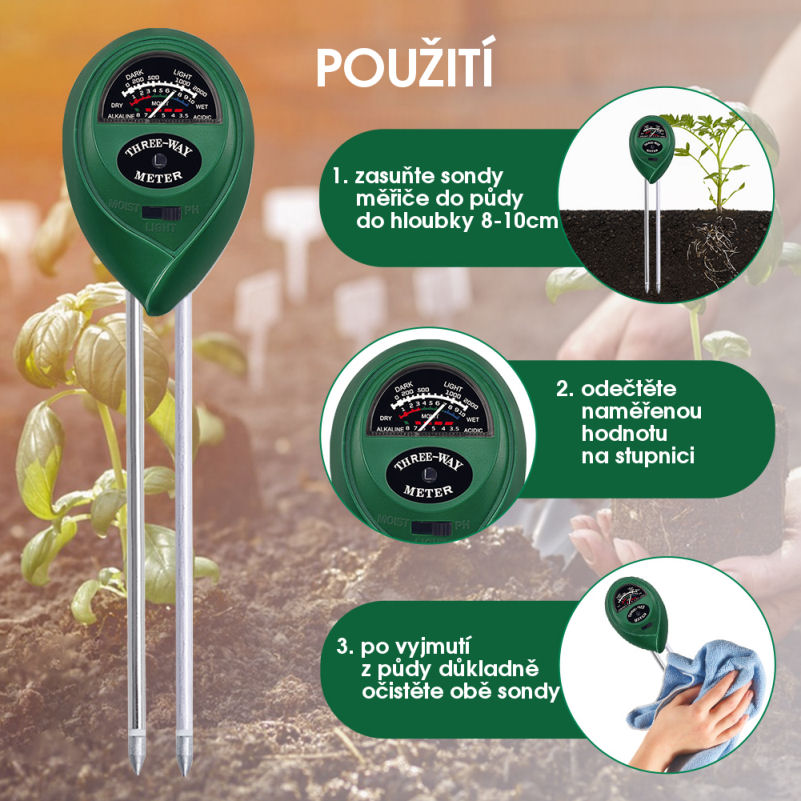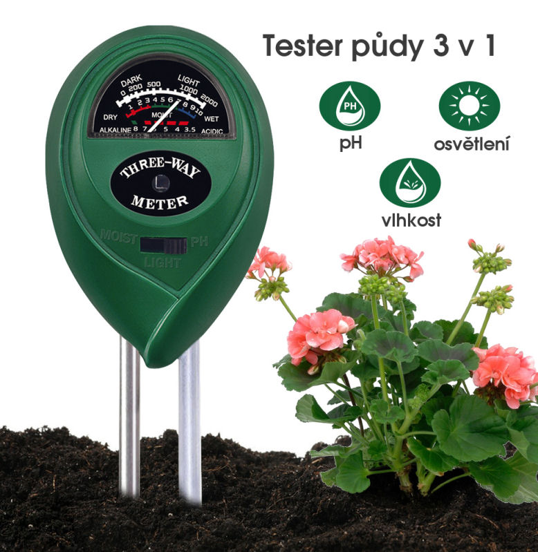 Kombinovaný měřič pro orientační měření vlhkosti, kyselosti půdy a osvětlení.Zobrazení naměřených hodnot ručkovým měřákem se stupnicí, přepínač pro měření jednotlivých veličin.