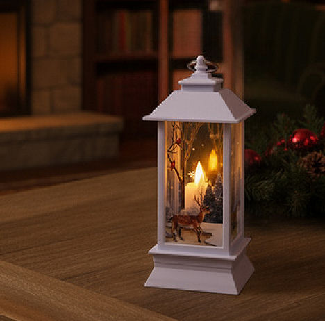 Vánoční LED lucerna na baterie – bílá dekorativní lucerna s teplým světlem a vánočním motivem